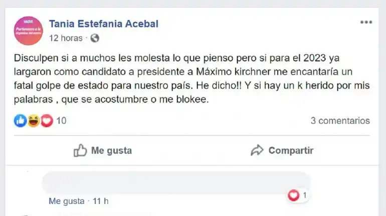 El Superior Tribunal de Justicia de Entre Ríos (STJ), en reunión de Acuerdo, resolvió "iniciar un sumario administrativo a la agente judicial Tania Acebal por haber difundido públicamente expresiones contrarias al sistema republicano", según informó el Alto Cuerpo en un comunicado. El STJ consideró que "tales afirmaciones serían violatorias de deberes del empleado judicial enumerados en el artículo 10 de la ley 5141 (estatuto del empleado judicial) y de disposiciones legales y constitucionales vigentes", sostuvieron. Acebal, candidata a gobernadora de Entre Ríos en las últimas elecciones provinciales, pidió "un fatal golpe de Estado para nuestro país" porque "para el 2023 ya largaron como candidato a presidente a Máximo Kirchner". Según la publicación que realizó el miércoles 13 de noviembre por la noche en su perfil de Facebook, la postulante del Partido SER que en las Generales obtuvo 10.935 votos -salió sexta con el 1,44% de los sufragios-, pidió disculpas "si a muchos les molesta" cómo piensa. "Si hay un k herido por mis palabras, que se acostumbre o me blokee (sic)", escribió en el posteo público. Tras las declaraciones, el coordinador del Registro Único de la Verdad de Entre Ríos, Marcelo Boeykens, envió una nota al presidente del STJ, Emilio Castrillón, para "hacer llegar a su conocimiento y a los efectos que estime pertinente, sobre las expresiones antidemocráticas difundidas en las redes sociales por la empleada judicial Tania Acebal". Acebal también fue noticia cuando tras las PASO, en vez de apoyar al candidato a intendente de Paraná por su espacio, Juan Carlos Sabadini, pidió el voto para el actual mandatario, Sergio Varisco (Cambiemos), quien iba por su reelección pero finalmente perdió contra el peronista Adán Bahl, actual vicegobernador.