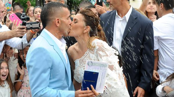 Los novios llegaron al Registro a las 10:08 en su camioneta Porsche, y acompañados por sus tres hijos: Florencia (9, quien llevaba en brazos a su perra, Dulce), Katie (6) y Lito Junior (2). Carlitos luciendo un traje celeste, al igual que Lito, y Vanesa con un vestido corto que dejaba al descubierto uno de sus hombros.