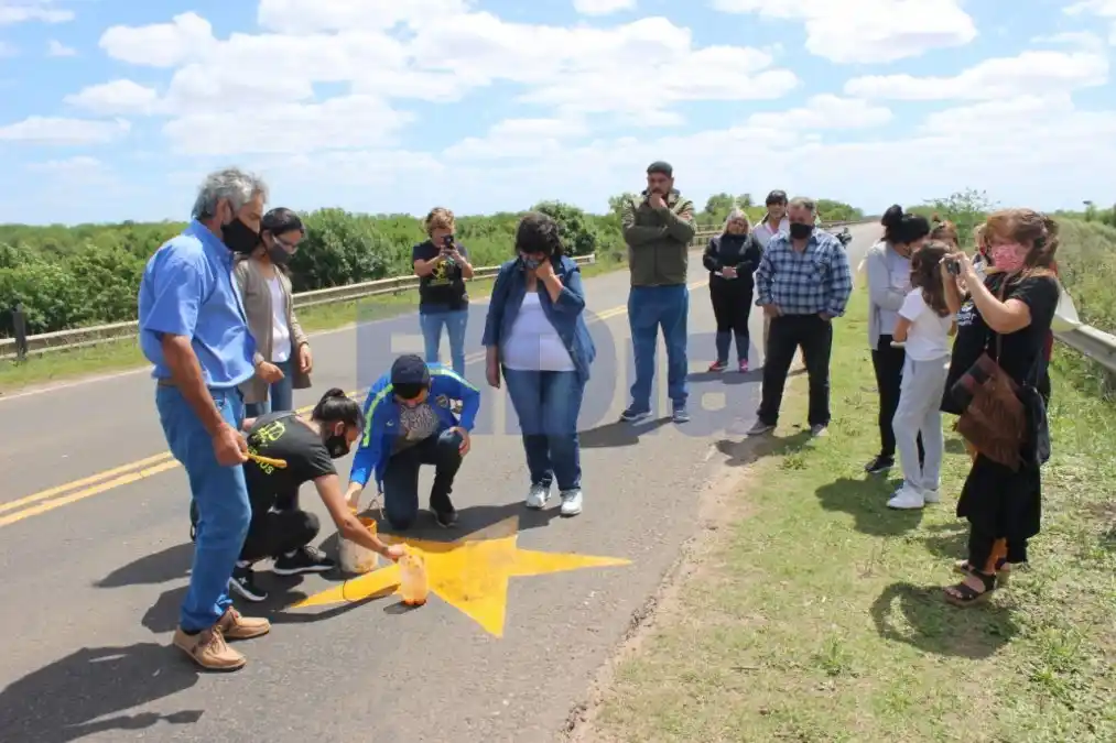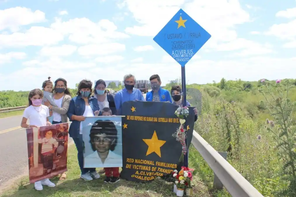 La ceremonia contó con la presencia de los padres, hermanos, y demás familiares que ocuparon la mitad de la ruta y la banquina en dirección a la República Oriental del Uruguay, con personal de Gendarmería Nacional controlando el tráfico en la ruta internacional. Previo al acto, el presidente de Aciverjus Miguel Gandolfo expresó que "junto a mis compañeros y los familiares de Gustavo Arrúa nos reunimos en este punto de la ruta 136, para dejar plasmada una estrella amarilla en el marco de la campaña de concientización nacional a las cuales representamos en la provincia", y contó que "ya sumamos 99 estrellas desde que iniciamos la campaña". El dirigente de la ONG agradeció a la familia de Gustavo destacando que "no es fácil estar acá, luego de que pasaran 29 años del siniestro vial, pero este es un acto de amor, como siempre decimos cada vez que acompañamos a los familiares". Luego de las palabras, se pintó la estrella amarilla en el asfalto de la 136. Lo hicieron sus padres, hermanos y sobrinos; mientras el Padre Carlos de Santa Teresita leía pasajes de la biblia. Familiares y amigos colocaron flores al pie del cartel que luego se descubrió. Una vez culminado el acto, posaron junto a la placa con fotos de Gustavo "Chinito" Arrua, en el momento más emotivo. El accidente La tarde/noche fatal fue el 24 de junio de 1991, en el entonces Puente Bailey que se había montado en la ruta internacional. El paso era de prácticamente una sola mano, cuando Ismael Arrua, padre de Gustavo, intentó cruzar el mismo con su Dodge 1500 en dirección al este. Lo hizo desviando una huella que dejaban los camiones para encarar el paso de un puente de no más de 30 metros. Lo que nunca esperaba Arrúa, era que un automóvil, proveniente del lado contrario subiera al puente a una velocidad imprudente y terminara impactando de lleno con el Dodge. Si bien Gustavo se encontraba en la parte trasera del auto, por la fuerza de la colisión sufrió golpes internos que posteriormente ocasionaron su deceso.
