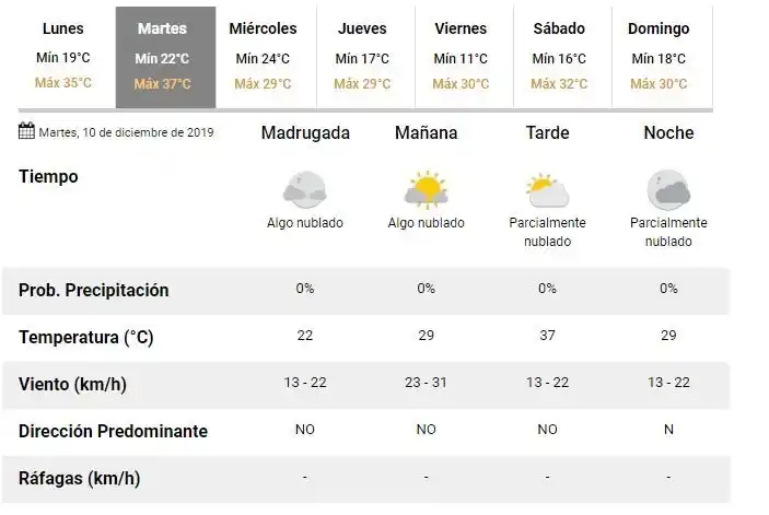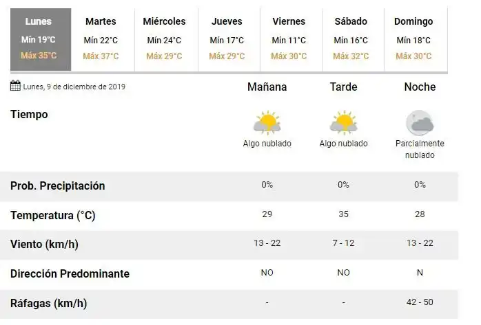 El comienzo de la semana llega con calor en Gualeguaychú, donde se esperan temperaturas que alcanzarán hoy los 35 grados por la tarde. Todo el día estará entre algo nublado y parcialmente nublado, con una mínima que no bajará de los 22 grados. El martes, por su parte, se espera que la temperatura siga en aumento y alcance los 37 grados, en un día que será un poco nublado y que tendrá una mínima de 19 grados. Las altas temperaturas se repetirán en sur de Entre Ríos, en el centro y norte de la provincia de Buenos Aires, centro y este de Córdoba, noreste de La Pampa y sur de Santa Fe, indicó un informe del Servicio Meteorológico Nacional. "Las temperaturas comenzarán a disminuir gradualmente entre el miércoles 11 y el jueves 12", dice el informe especial publicado en la página web del organismo. El viernes el clima será algo más moderado, con una mínima de 11 y una máxima de 30. El fin de semana se espera que sea caluroso pero gris: habrá alta nubosidad pero las máximas pasarán los 30 grados.