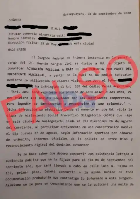 Tanto el comerciante como el Juzgado Federal de Gualeguaychú confirmaron a ElDía que se trata de una fake news, ya que tal denuncia no existió, y por lo tanto tampoco la citación al comerciante ni la multa aplicada que figura en los papeles truchos.