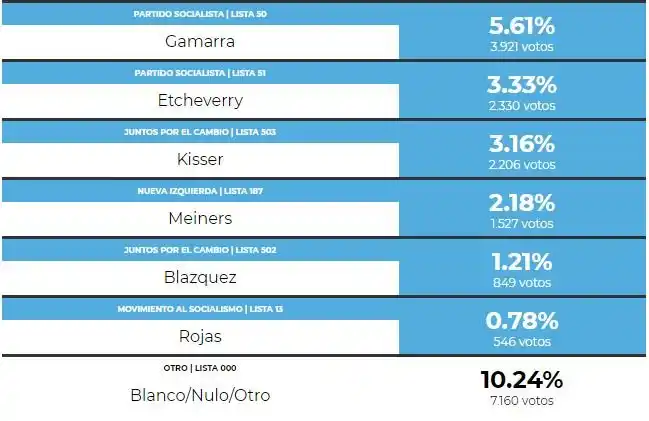 Con el 86,78% de las mesas escrutadas en Gualeguaychú, el candidato a Senador nacional del Frente de Todos Edgardo Kueider queda en primer lugar en las elecciones Primarias Abiertas Simultáneas y Obligatorias (PASO) con el 39,71% de los votos (27.355). En segundo lugar quedó el candidato de Juntos por el Cambio el gualeguaychuense Alfredo de Angeli, que obtiene el 34,34% de los votos (24.000) La diferencia entre ambos es de 3355 votos. El resto de los candidatos va quedando en el siguiente orden: Por su parte, el candidato a Diputado nacional del Frente de Todos Marcelo Casaretto queda en primer lugar en las elecciones PASO con el 38,93% de los votos (27.212). Y al igual que con los senadores, la que quedó en segundo lugar es la candidata de Juntos por el Cambio Gabriela Lena, quien obtiene el 34,22% de los votos (23.918) La diferencia entre ambos es de 3294 votos. El resto de los candidatos va quedando en el siguiente orden: