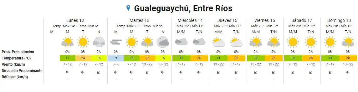 Este lunes, feriado por el Día del Respeto a la Diversidad Cultural, comenzó con el cielo despejado en Gualeguaychú, y se estima que durante la semana prevalecerá de la misma manera. El SMN marca una mínima de 6ºC. y una máxima de 24ºC para hoy, y que para los próximos días la temperatura oscilará entre los 9ºC. y los 25ºC. Mientras que el fin de semana se espera que esté aun más caluroso, con una máxima que alcanzará los 28ºC. Además, no se esperan lluvias durante los próximos siete días.