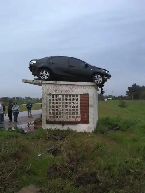 El impresionante accidente ocurrió esta mañana, a la altura del ingreso a Colonia Hughes, en el Departamento Colón. El auto, habría impactado contra el guardarrail y, terminó sobre el techo de una garita de colectivos.