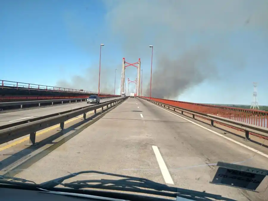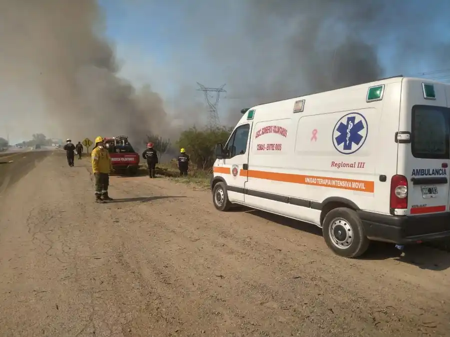 Pasadas las 14.20, desde el puesto de Gendarmería nacional Paraná Guazú, se alertó a los Bomberos Voluntarios sobre un frente de fuego de unos 400 metros que variaba por la velocidad del viento. De inmediato se desplegó un operativo que - por las dimensiones- involucró a una dotación de Ceibas y de Villa Paranacito, a la que se sumaron dos dotaciones de Gualeguay, una de Ibicuy y otras dos dotaciones de Ceibas. Según informó el jefe de Bomberos Voluntarios de Ceibas, Marcelo Paredes, "la complicación es la línea de alta tensión, porque el fuego pasa por debajo y es imposible trabajar", y además indicó que durante la tarde "cuatro bomberos quedaron encerrados entre los pajonales y el humo, y debieron ser rescatados por sus compañeros, aunque ya se encuentran bien". "Se mantiene el trabajo y se espera por la evolución del fuego y que salga hacia la zona de banquinas, ya que es una zona de mucha arboleda y pajonales es imposible arriesgar el personal", mencionó Paredes. A su vez, un camión cisterna de la empresa concesionaria Río Uruguay, brinda apoyo hídrico a las unidades de bomberos abasteciéndolas. La calzada de Buenos Aires hacia Entre Ríos se encuentra reducida desde el kilómetro 114 al 115, a cargo la asistencia de Gendarmería Nacional. "Se ha quemado más de 800 metros lineales por 800 de ancho y el fuego se desarrolla con mucha intensidad", informó Paredes.