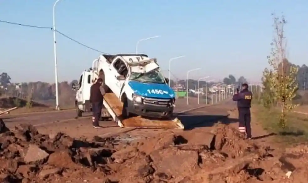 Una camioneta policial chocó y volcó en un acceso en construcción