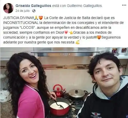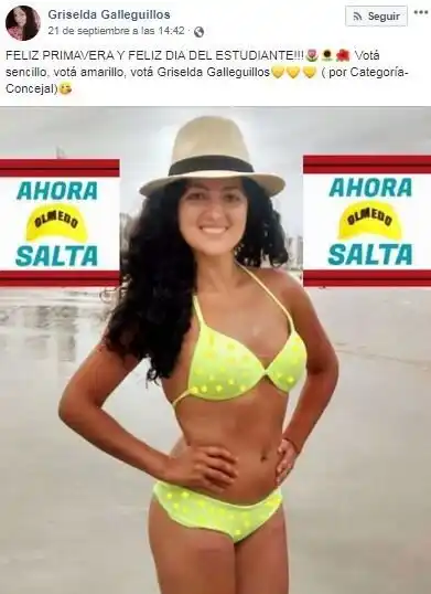 Dos ediles del municipio salteño de Rosario de Lerma son duramente criticados por sus polémicas iniciativas y exhibiciones en redes sociales, que van desde sorteos de bombachas y bebidas alcohólicas hasta participar de insólitos retos virales. Con el comienzo de la primavera "floreció" un nuevo posteo que generó gran indignación: la concejal posó en bikini para desear feliz día del estudiante y pedir que voten su lista en las próximas elecciones. Se trata de los hermanos y concejales, Griselda y Guillermo Galleguillos, quienes son populares entre los vecinos por sus desarcertadas publicaciones en Facebook. En una estrategia para aumentar seguidores, sumar "me gustas" y promocionar su campaña, los hermanos Galleguillos también lanzaron polémicos sorteos de bombachas e incluso de bebidas alcohólicas con la premisa "si vas a beber, no conduzcas". El colmo fue el peculiar "saludo" por Día de la Primavera y del Estudiante, en que Griselda posó en una bikini amarilla con la que instó a sus seguidores a votar su lista en las próximas elecciones: "Votá sencillo, votá amarillo, votá Griselda Galleguillos". Este accionar de los concejales no pasó desapercibido por sus colegas en el recinto. El Concejo Deliberante de Rosario de Lerna había sancionado el año pasado a Guillermo con la quita del 25% del total que percibe como dieta e instó a los hermanos a presentar un certificado de aptitud psicológica. Sin embargo, la Corte de Justicia de Salta falló a favor de los Galleguillos. Como era de esperarse, ellos lo celebraron por Facebook: "Justicia divina!!! Aunque se empeñen en descalificarnos ante la sociedad, siempre confiamos en Dios".