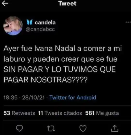 Ivana Nadal quedó en vuelta en otro escándalo este último fin de semana, después de que una joven la acusara de haberse ido sin pagar del bar donde trabaja como mesera. “Ayer fue Ivana Nadal a comer a mi laburo y ¿pueden creer que se fue sin pagar y lo tuvimos que pagar nosotras?”, escribió Candela en su cuenta de Twitter y, a pesar de que decidió eliminar e mensaje minutos después, el poste no tardó en hacerse viral. Fue tal la repercusión que se armó, que la modelo se contactó con la internauta para explicarle lo que había ocurrido y saldar su deuda. “Hola Cande. ¿Todo bien? ¿Vos hiciste un tuit donde dijiste que yo me fui de un restaurante sin pagar y lo tuviste que poner vos? Quería saber dónde trabajabas y cuánto habías pagado, porque el único lugar donde fui fue una invitación. Pero si te lo hicieron pagar pasame tu cuenta y listo, ningún problema”, afirmó Nadal. Asustada por la repercusión, Candela le respondió a la influencer y aclaró: “Cuando te fuiste nos preguntaron qué pasó con esa mesa y que igual tenías que pagarla. Empezaron a arrobar a Ángel De Brito... Ya está, ya terminó. Me empezó a hablar gente y me dio miedo. No quiero quilombo”. Lo cierto es que Nadal no se quedó tranquila y le consultó a la persona que la había invitado a comer gratis a dicho restaurante qué fue lo que ocurrió. Según la modelo, él -que resultó ser el dueño del lugar- le confirmó que Candela había mentido con la acusación y rápidamente, Ivana comenzó a recibir todo tipo de críticas y amenazas por poner en "riesgo" el empleo de la mesera. “La chica no perdió su trabajo, si prestan atención, yo le digo a mi amigo, que es quien me invitó al bar, que quien debía tener un llamado de atención es quien no le avisó que yo era invitada, pero eso ella lo sabía”, sostuvo. En su descargo, la morocha remarcó que la joven "no perdió su trabajo" y destacó que tampoco tuvo que poner plata de su bolsillo, tal y como había denunciado en las redes sociales.
