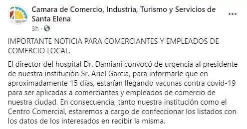 La Cámara de Comercio, Industria, Turismo y Servicios de Santa Elena anunció este miércoles que los trabajadores del sector serán vacunados contra el coronavirus en la ciudad. Con una publicación a través de sus redes sociales, desde la entidad se aseguró que el director del Hospital Santa Elena, Javier Damiani "convocó de urgencia al presidente de nuestra institución, Ariel García, para informarle que, en aproximadamente 15 días, estarían llegando vacunas contra Covid-19 para ser aplicadas a comerciantes y empleados de comercio de nuestra ciudad", según pudo registrar La Sexta. "En consecuencia, tanto nuestra institución como el Centro Comercial, estaremos a cargo de confeccionar los listados con los datos de los interesados en recibir la misma", concluyeron. (Ahora)