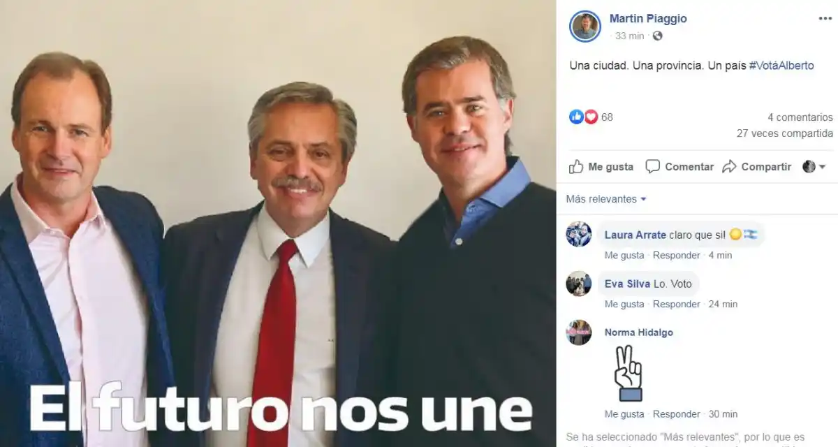 “Una ciudad. Una provincia. Un país #VotáAlberto”, con esa frase el intendente de Gualeguaychú puso primera de cara a la campaña presidencial que terminará el domingo 27 de octubre, y que tiene al candidato del Frente de Todos, Alberto Fernández, como favorito, tras la gran victoria de las PASO sobre el presidente Mauricio Macri. En su cuenta de Facebook, Piaggio subió la frase junto a una foto en la que está con el propio Fernández y el reelecto gobernador de Entre Ríos, Gustavo Bordet. Y, en el pie de la imagen, la frase "el futuro nos une".