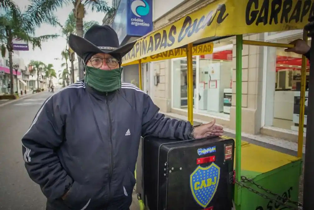 tuvo que dejar de vender garrapiñadas Oscar Irigoyen es uno de esos gualeguaychuenses que no necesita presentación, lo conocen y saludan todos los vecinos. El 9 de abril 1987 fue cuando vendió garrapiñadas por primera vez, en la histórica visita del Papa Juan Pablo II a Paraná. “Un amigo me trajo la receta de Buenos Aires y nos fuimos a vender”, cuenta. Desde que volvió de aquel viaje se transformó en “el garrapiñero” de Gualeguaychú. No lo frenó ni la crisis del 2001 ni tantas otras que atravesó el país, pero si, por el momento, la pandemia del Covid-19. “No sé qué traba me pone Inspección, yo tranquilamente podría trabajar, lo mío es una venta al paso”, se queja Oscar, que tuvo que cambiar el carrito por la bici: ahora es delivery. “Parado no me puedo quedar, tengo que darle de comer a mi familia”, expresa uno de los tres comerciantes con más antigüedad en el centro de la ciudad: “Sólo me ganan una óptica y una agencia de quiñela”, chapea y se acomoda su característico sombrero. Con su nuevo oficio, el hincha fanático de boca “pucherea” y conoce nuevos puntos de la ciudad. “Hay barrios que no sabía que existían, pero les llevo el pedido igual”, marca, y cuenta dos compañeros suyos atraviesan una situación similar, “un chofer de larga distancia y un empleado de restaurante”, ambos también están haciendo cadetería. Lo que no cambia Oscar es de look, debajo del tapaboca mantiene su tupido bigote, y siempre lleva consigo su excéntrico sombrero. El hombre de 64 años, junto a su nieto y sucesor Héctor, espera ser habilitado. “Él anda ofrenciendo en los kioscos, varios nos compran, más por colaborar porque nos conocen que otra cosa, pero sin el movimiento escolar es bravo”, lamenta. “De a ratos tengo ganas de meterme de prepo”, confiesa, pero “uno es educado y no quiere andar peleándose en el carrito”. Ojalá Oscar, como tantos miles de trabajadores, pueda volver a su trabajo pronto.
